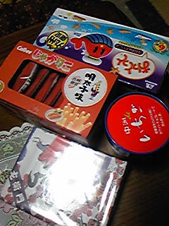 貼りはふざけて買ってきた地方限定とは名ばかりの、東京産の空港とか駅とか行けばどこにでも売ってるお菓子達